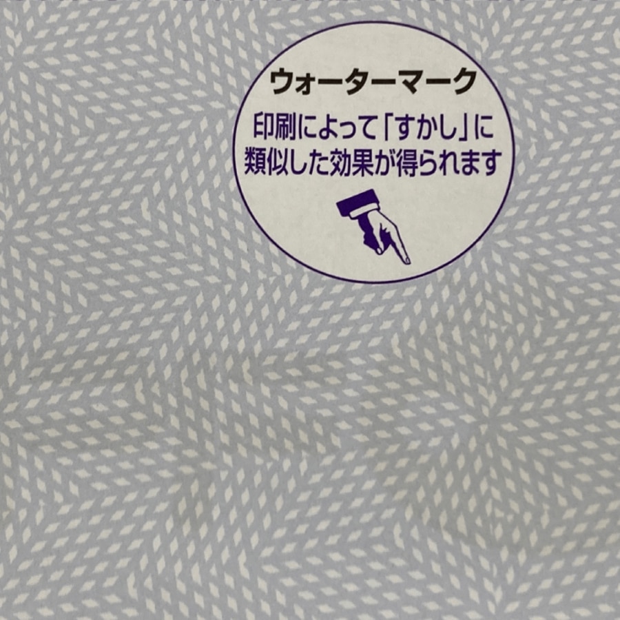 透かし文字 / ウォーターマーク | 紙を透かしたときに文字や模様が見えるようにする加工 | 〇 | ◎ |