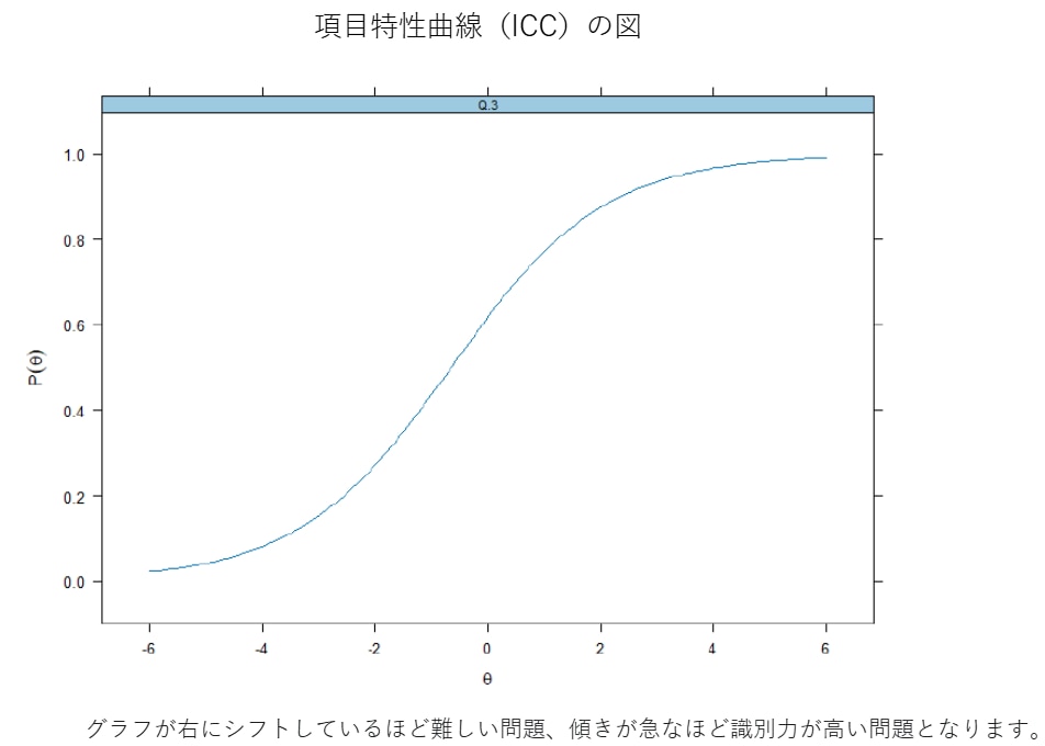 [項目特性曲線 ICC]横軸は受験者の能力値で、グラフ中央θ=0が標準的な能力の受験者となり、θが高いほど正答確率が上がる様子を表します。一般にθ=b付近で正答確率が大きく変化しやすく、その付近での“曲線の鋭さ”が識別力aに関係します。